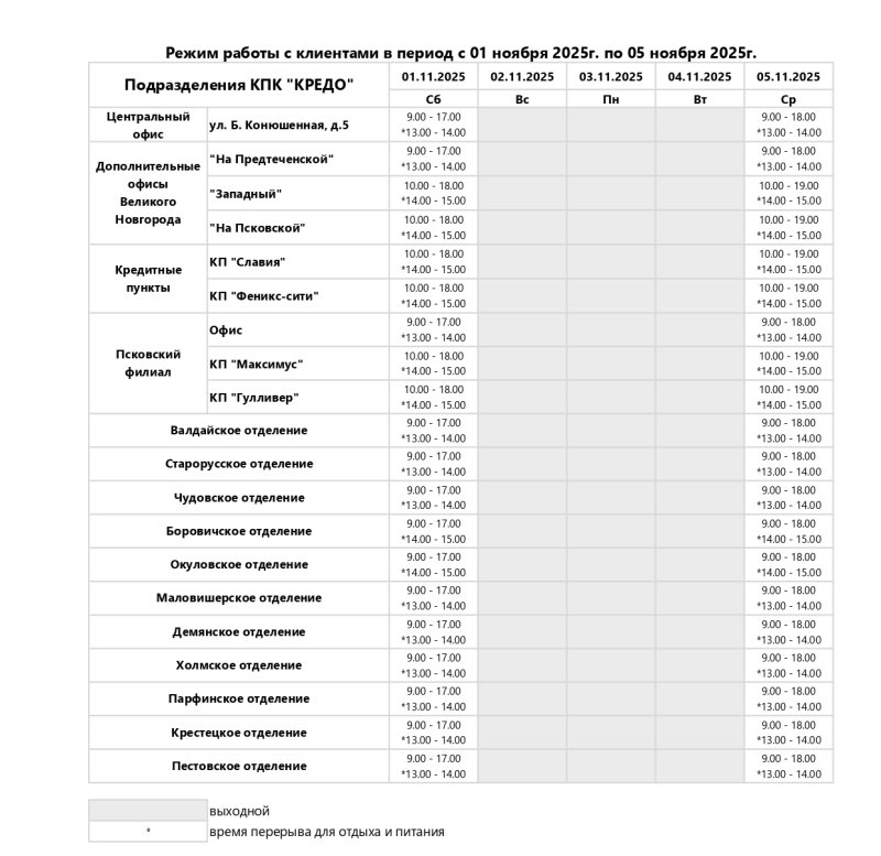 30-10-2025, просмотров: 3 Режим работы подразделений КПК «КРЕДО» в праздничные дни ноября Подписывайтесь на наши новости в группе КПК «КРЕДО» в социальной сети Вконтакте другие новости: 30-10-2025 Режим работы подразделений КПК «КРЕДО» в праздничные дни ноября 25-09-2025 День воспитателя в гор. Малая Вишера 25-09-2025 День города в Окуловке архив новостей