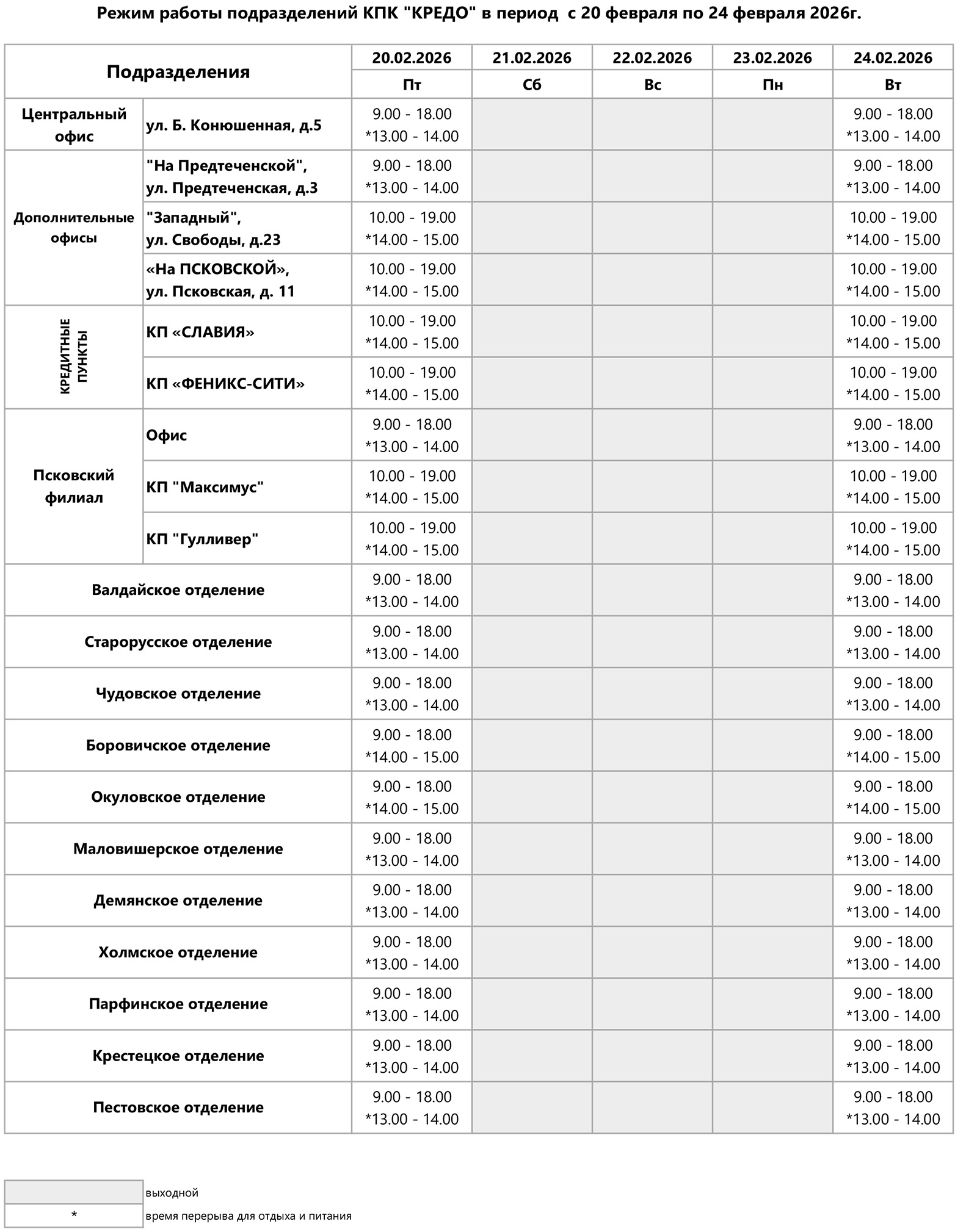 20-02-2026, просмотров: 8 Режим работы подразделений КПК «КРЕДО» в праздничные дни февраля Подписывайтесь на наши новости в группе КПК «КРЕДО» в социальной сети Вконтакте другие новости: 20-02-2026 Встреча с коллективом МЧС: КПК «КРЕДО» поздравил спасателей Новгородской области с наступающими праздниками 20-02-2026 Режим работы подразделений КПК «КРЕДО» в праздничные дни февраля 20-02-2026 Поздравляем вас с Днём защитника Отечества! архив новостей